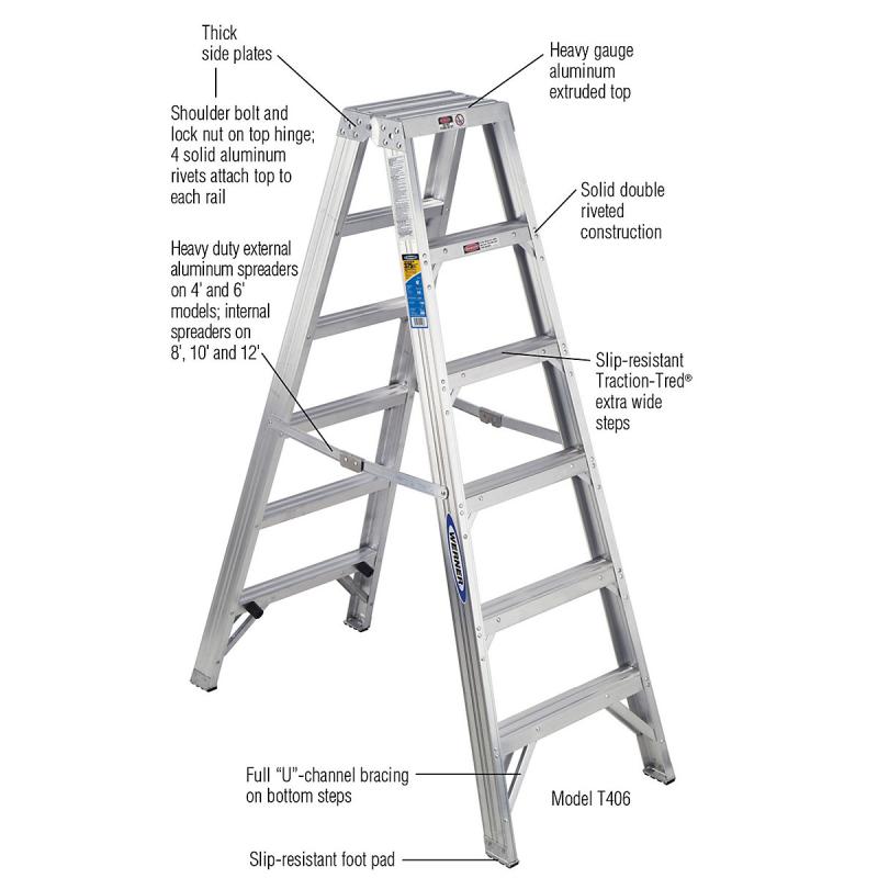 The aluminium Multi-Use Twin Stepladder T400 series has a duty rating of 375 pounds per side making these ladders ideal for one or two-person jobs. The tops are made of heavy gauge extruded aluminum, and the steps are connected with a solid double riveted construction. The extra wide TRACTION-TRED steps are slip resistant. The bottom steps are braced with full U channel knee braces.