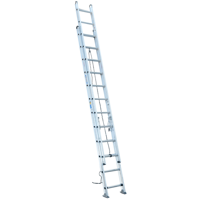 The D500-2 aluminum extension ladders have a duty rating of 375 pounds and feature the exclusive ALFLO rung joint for a TWIST-PROOF performance every time. The end caps are mar resistant and notched for easy separation of sections. Both the base and the fly sections can be used separately. Internal guides increase the ease of operation when raising and lowering. The feet are heavy-duty, self-aligning and free swinging for hard or penetrable surfaces. Rugged spring-loaded locks operate smoothly. TRACTION-TRED D rungs are slip resistant. Duty rating changes to 300 pounds for 36'-48' models.