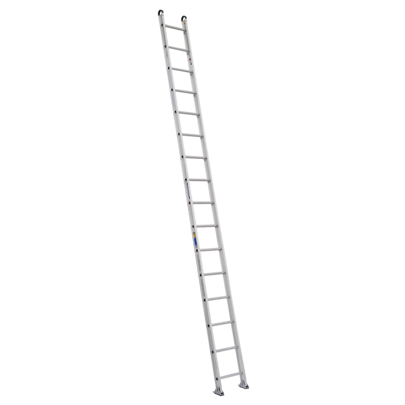 The 500-1 series are one-section round rung straight ladders with a duty rating of 375 pounds. The exclusive ALFLO rung joint means TWIST-PROOF performance every time. The side rails are extra heavy duty I-beam rails and the aluminum round rungs are deeply serrated for slip resistance. The duty rating goes to 300 pounds with the 18', 20' and 24' lengths.