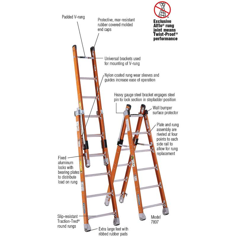 The 7800 combination step and extension ladders are versatile and easy to transport yet carry a duty rating of 375 pounds. As an extension ladder, the top rung is a padded V-rung for use against a tree or a pole. The protective rubber covered end caps are mar-resistant. Nylon-coated rung wear sleeves and guides increase the ease of raising and lowering the extension. Fixed aluminum locks with bearing plates distribute the load onto the rung where it should be. The TRACTION-TRED round rungs are slip resistant. In the stepladder position, this ladder can be used by one or two people. The 375 pound duty rating applies to each side of the ladder making it ideal for the worksite.