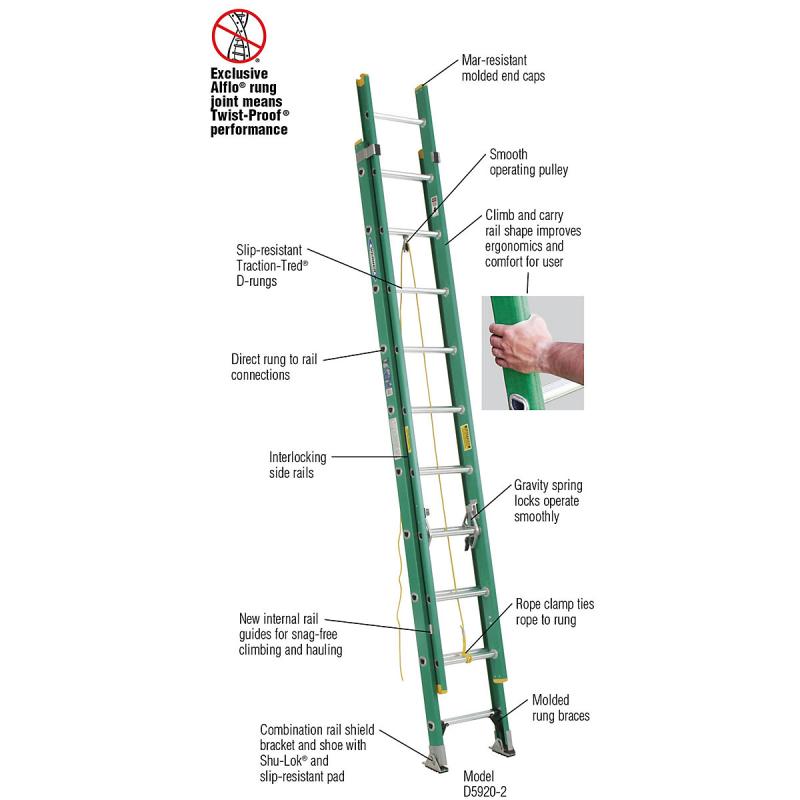 D5900-2 fiberglass extension ladders feature a rounded rail for improved ergonomics while climbing and carrying. The non-conductive fiberglass rails are interlocking and the exclusive ALFLO rung joint means TWIST-PROOF performance every time. The TRACTION-TRED D rungs are slip resistant. These extension ladders are lightweight for transporting and manuevering yet still have a duty rating of 225 pounds.