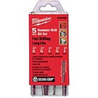 Milwaukee's 3-Flat Secure-Grip™ Hammer-Drill Bits provide superiority in regards to quality, performance and longevity of life. The 3-Flat Secure-Grip™ shank is designed to fit in all 1/2 in. three jaw hammer-drill chucks and reduces the possibility of the bit spinning in the chuck during heavy torsional loads. The bits drill faster and last longer than other hammer-drill bits on the market due to their reinforced flute geometry and carbide tip design. Milwaukee's offering has a range of diameters from 1/8 in. to 1 in. with lengths up to 18 in. Five piece kit.