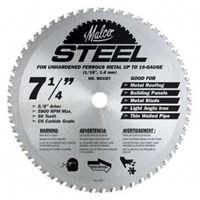 Specially formulated, tough c-6 carbide tipped blade fits all popular brands of portable circular saws. Lasts up to 30 times longer than abrasive disks for cutting unhardened ferrous metal. Makes true, flat cuts in standing seam metal roofing and metal building panels without burning paint or protective coatings. Also makes clean cuts in metal studs, light angle iron and thin walled pipe.