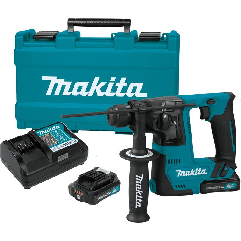 The 12V max CXT™ Cordless 9/16” Rotary Hammer Kit (model RH02R1, accepts SDS-PLUS bits) delivers power and speed in a compact size for work in tight spaces and overhead applications. With Makita 12V max CXT™ Lithium-Ion slide-style batteries, users get superior balance and ergonomics over pod-style batteries. For added convenience the batteries include an on-board L.E.D. charge level indicator. The RH02R1 has a Makita-built variable speed motor that delivers 0-850 RPM, 0-4,900 BPM and 0.73. ft.lbs./1.0 Joules of impact energy for faster drilling. It has 2-mode operation for “rotation only” or “hammering with rotation”. The compact size and lower weight (only 4.3 lbs. with 12V max CXT™ 2.0Ah battery) mean reduced fatigue for operators, especially for overhead applications. Additional features include a vibration-absorbing handle that moves independently of the motor and hammer mechanism for increased operator comfort, as well as a variable speed trigger, built-in L.E.D. lights, and one-touch sliding chuck for easy bit changes. For longer run time, 12V max CXT™ cordless tools are also compatible with the 12V max CXT™ Lithium-Ion 4.0Ah battery (BL1041B, sold separately). 12V max CXT™ Lithium-Ion batteries are engineered with a Battery Protection Circuit that protects against overloading, over-discharging and over-heating. It’s part of the expanding 12V max CXT™ series, combining performance with superior ergonomics in a compact size.