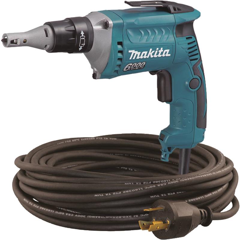 The Makita 6,000 RPM Drywall Screwdriver (model FS6200TP) delivers speed, power and ergonomics. The FS6200TP includes a 50 ft. twist lock cord for increased convenience. It is ideal for hanging sheet rock on wood frame. 6 AMP Motor Delivers 6,000 RPM The FS6200TP is powered by a 6 AMP motor that delivers 0-6000 RPM and includes a large variable speed trigger with lock-on button for continuous use. The adjustable depth locator assembly with Makita’s Sure-Lock™ feature is engineered for consistent screw depth. Comfort and Ease-of-Use Features The FS6200TP has an ergonomic grip for increased comfort, and a cast aluminum gear housing for less weight (only 3.0 lbs.) and increased durability. Other features include a depth locator holder for convenient storage during framing applications, a bit storage on the base of the grip to reduce downtime, and an LED light to illuminate the work surface. Versatile Design for a Range of Applications The FS6200TP is engineered for hanging applications, and is ideal for drywall contractors, acoustical contractors, carpenters, plaster contractors, maintenance, and general contractors seeking a best-in-class drywall screwdriver.