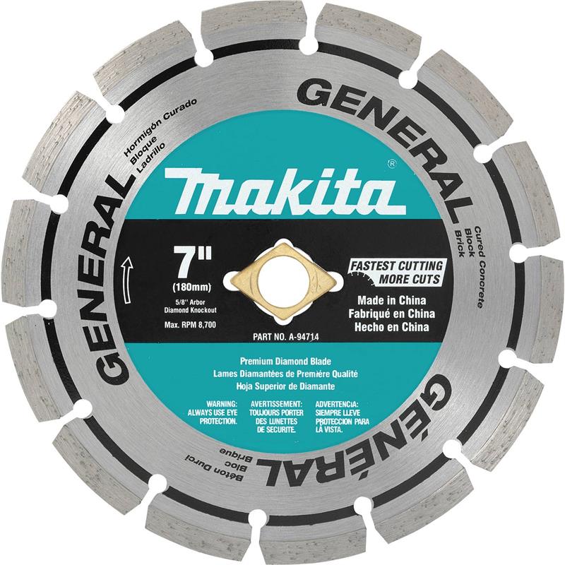 The Makita 7" Segmented Rim Diamond Blade is ideal for general purpose cutting applications including block, brick and cured concrete. The segmented slots are engineered to deliver a faster yet cooler cut. Diamond blades are part of Makita's growing line-up of solutions for concrete applications.