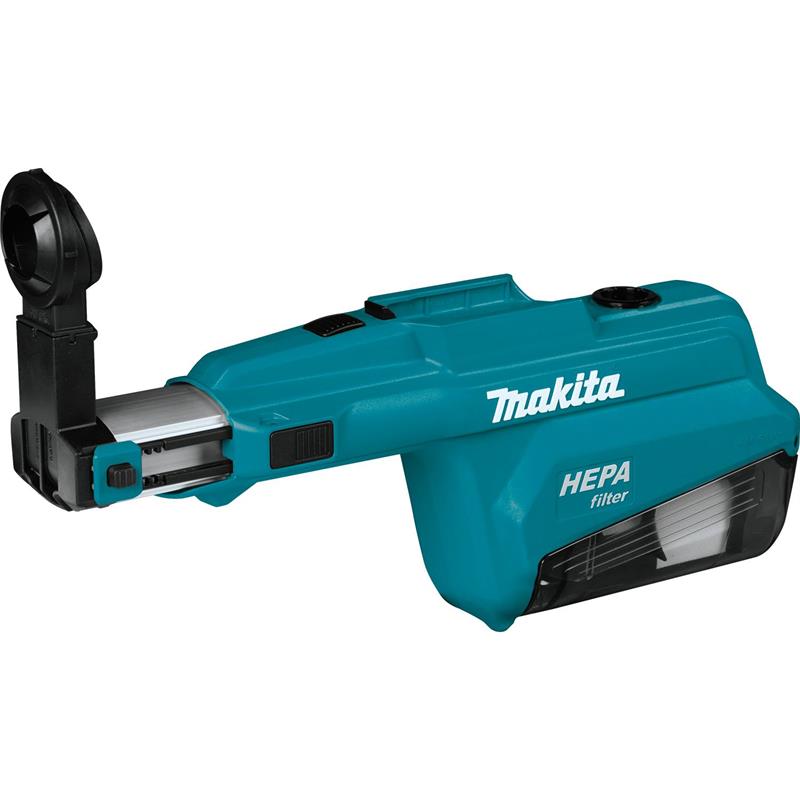 The Dust Extractor Attachment with HEPA Filter (model 135905-6) is for use with Makita 1" Rotary Hammers, models HR2661 and HR2651 (all rotary hammers sold separately). The attachment captures concrete dust during drilling and is powered by a secondary motor fan blade in the tool to maintain efficient dust suction performance when activated by the tool’s trigger. It features an efficient HEPA filter engineered to capture 99.97% of dust particles (size .3 microns and larger) for improved dust collection. The high-capacity dust container is clear and provides an accurate level indicator of collected material, and has a quick release and can be easily detached from the dust collection attachment when needed. Added features include a depth stop adjustment that allows drilling up to 7-7/16” deep and up to 1” diameter bits.